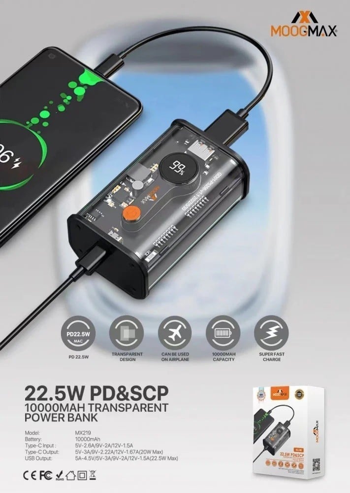 بطارية شفافة بوزن خفيف بسعة 10000 مللي أمبير من موج ماكس